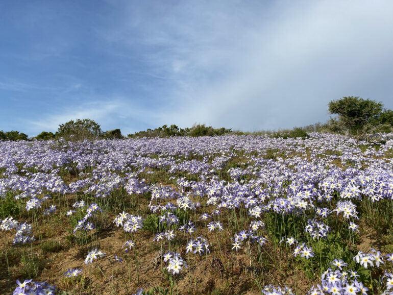 “Depende un poco de lo que busco en el desierto florido. En la Región de Coquimbo, si busco un símil a las grandes extensiones que se ven en la Región de Atacama, tendría que ir a zonas de dunas, como las de Caleta San Pedro o Caleta Hornos, donde hay espacios más amplios para ver ese tipo de vegetación. Pero también puedo observar el desierto florido en su forma más arbustiva: por ejemplo, al subir el Cerro Grande se pueden ver los arbustos típicos de la zona en flor, combinados con especies como las añañucas, los suspiros o los cebollines”.